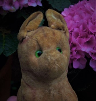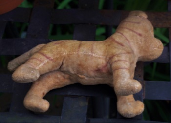 This little cat measures just 6" long (not including his tail) x 5" tall. He is stuffed with either excelsior, straw or something similar, but not fabric or cotton!