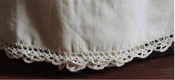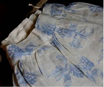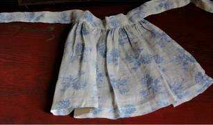 The skirt could double as a petticoat as it was trimmed at the hem with early unobtrusive cotton lace. The pattern on the apron is white with a blue clover pattern on white.